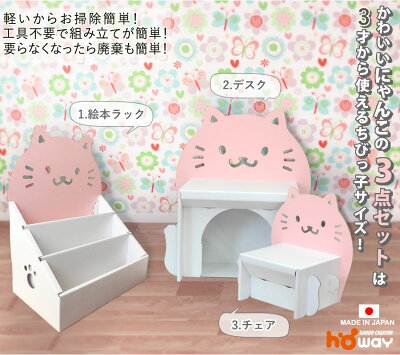 ■特徴■ 初めて向かう自分専用の可愛いネコ型デスク&チェアと絵本ラックの3点セットです。